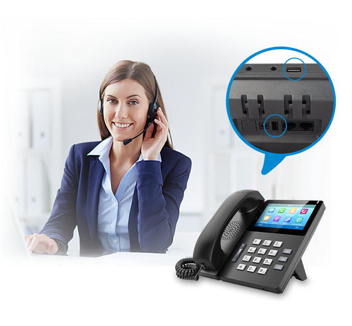 Les deux interfaces USB permettent de brancher une clé pour enregistrer vos conversations importantes ou de connecter un adaptateur EHS10 pour les casques sans fil DECT, offrant ainsi une flexibilité d'usage adaptée aux environnements professionnels les plus exigeants.